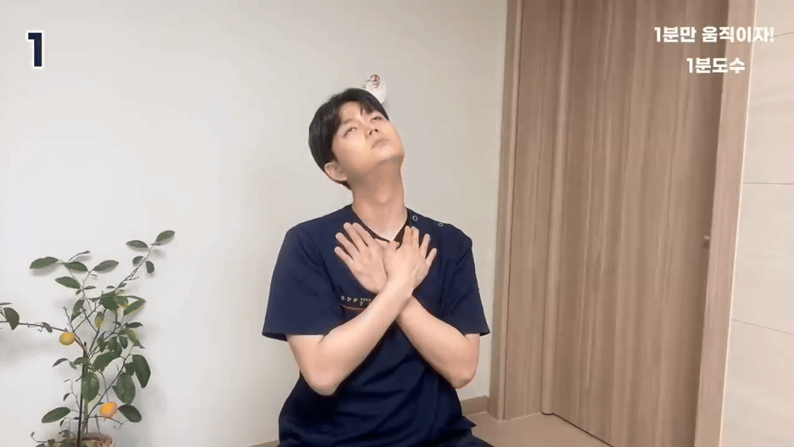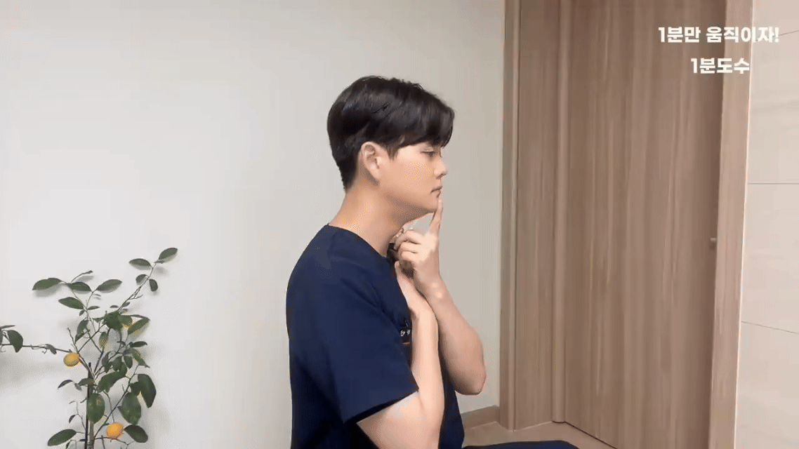 (이중턱 만들기)그 상태를 유지하며 천천히 천장 바라보기