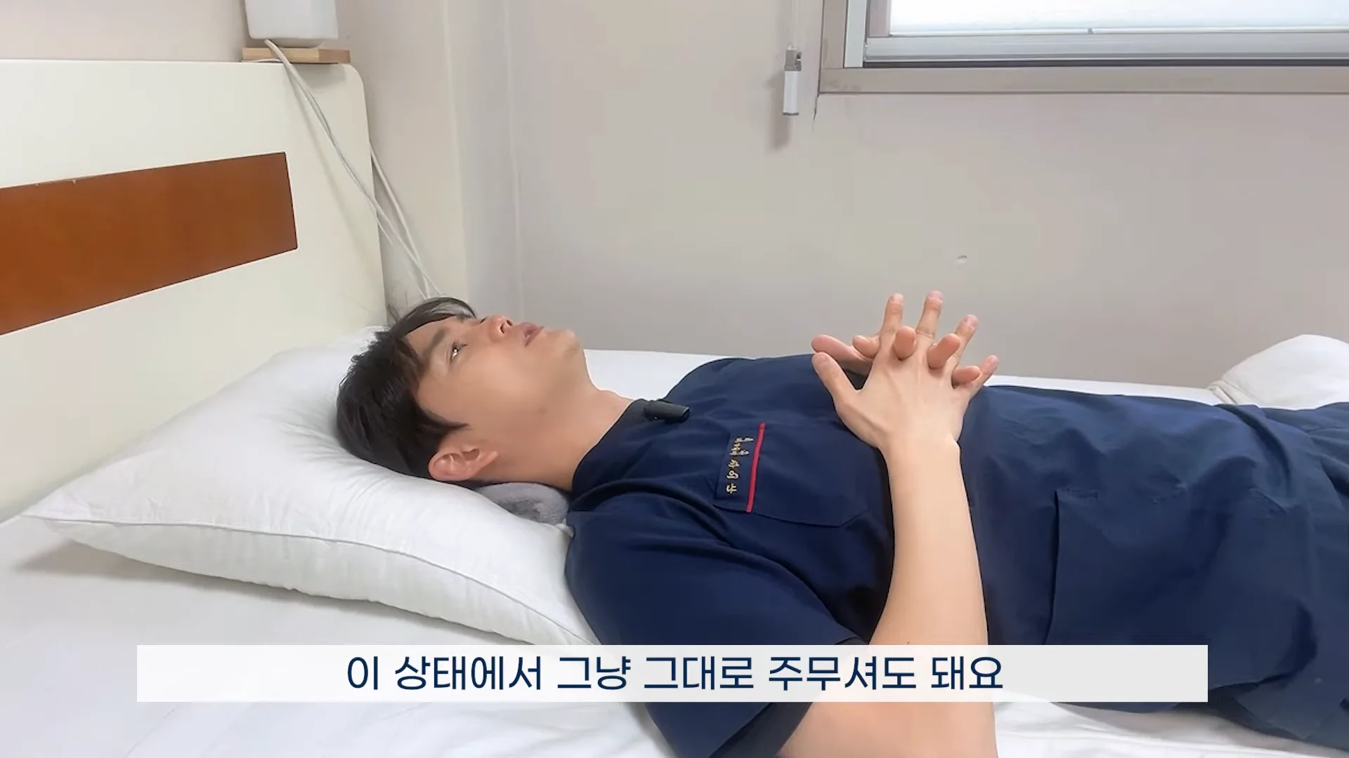 Step 2. 위치 잡기: 목 뒤 가장 볼록 튀어나온 뼈(상부 흉추) 바로 아래부터 베개가 시작되게 눕습니다.