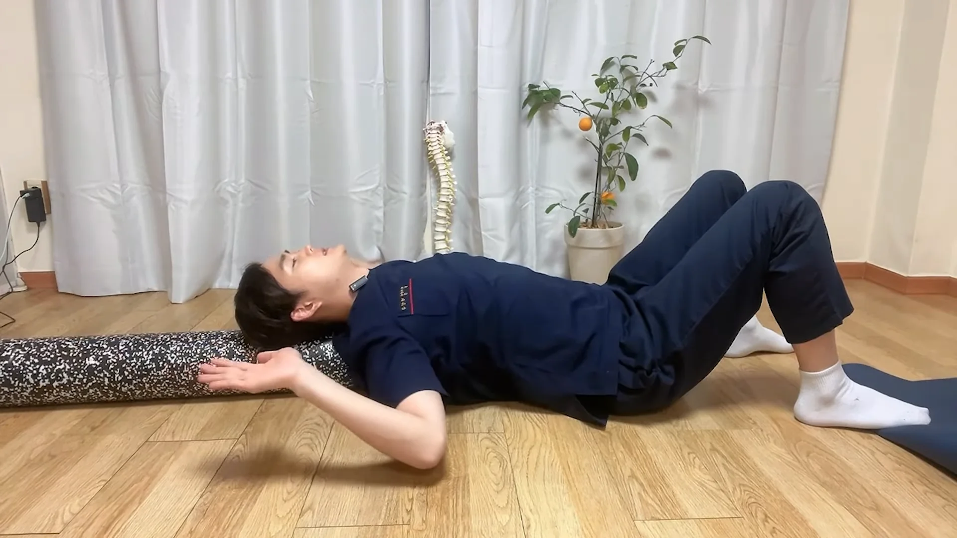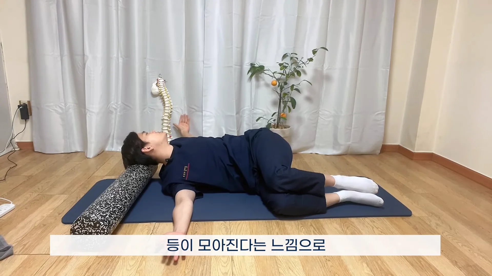 폼롤러 세로 스트레칭: 폼롤러 위에 세로로 누워 가슴 근육을 시원하게 늘려주세요.