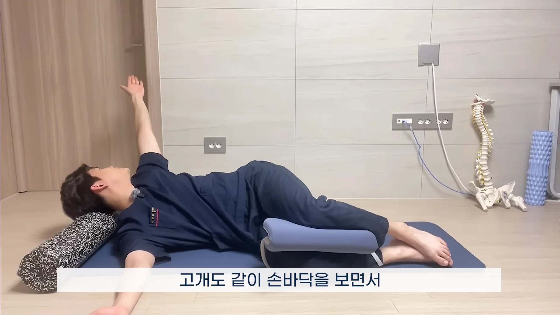 옆으로 누워 팔 돌리기: 옆으로 누워 무릎 사이에 방석을 끼고 한쪽 팔을 크게 원을 그리며 뒤로 넘깁니다. 손바닥을 시선이 따라가는 것이 포인트입니다. (양쪽 10회씩 3세트)