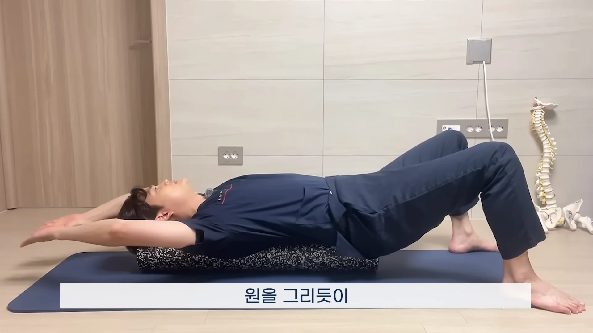 폼롤러 W-스트레칭: 폼롤러 위에 세로로 누워 팔을 W자로 만든 뒤 날개뼈를 접으며 위아래로 움직여주세요.