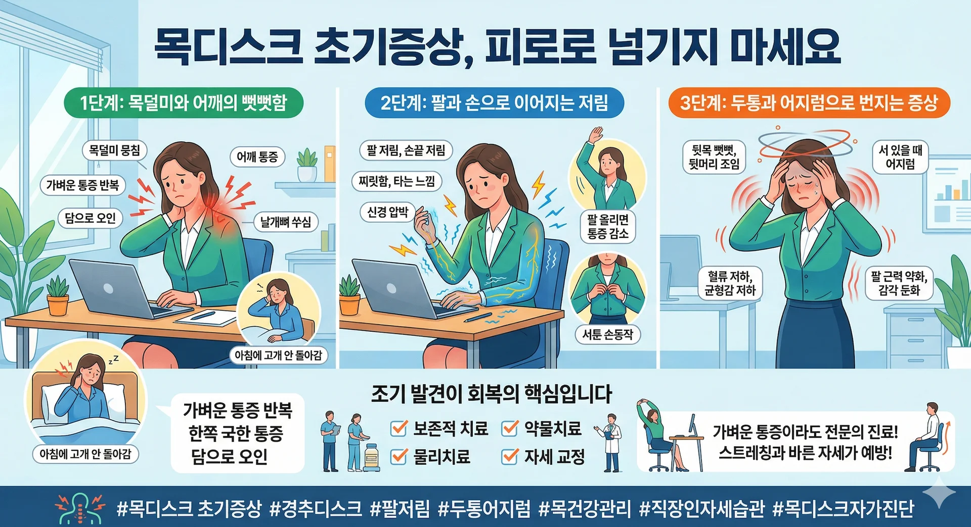 목과 어깨의 뻐근함 → 팔 저림 → 손 감각 이상 → 두통·어지럼