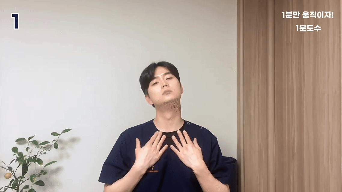 고개를 좌우로 천천히 돌리며 굳은 근육을 풀어줍니다.