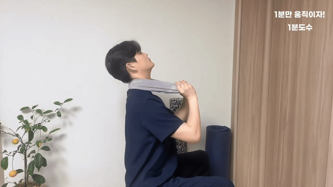준비: 수건을 준비해 목 위쪽이 아닌 아래쪽에 팽팽하게 겁니다.