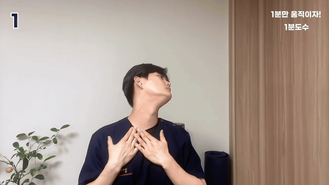 동작: 상체는 고정한 채 목만 뒤로 쭉 넘깁니다.