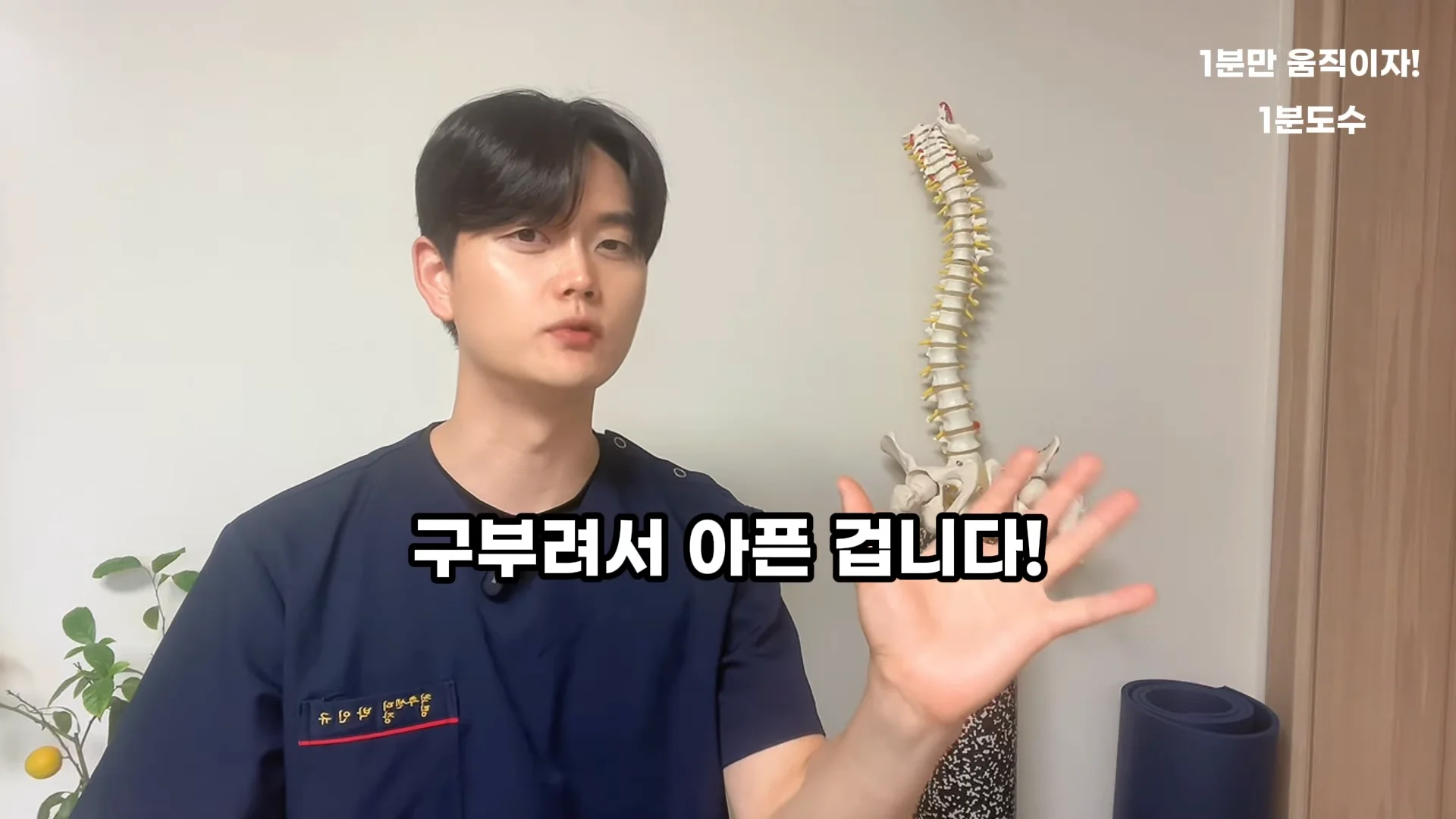 이 동작은 밀려 나온 디스크를 제자리로 돌려보내는 핵심 운동입니다.